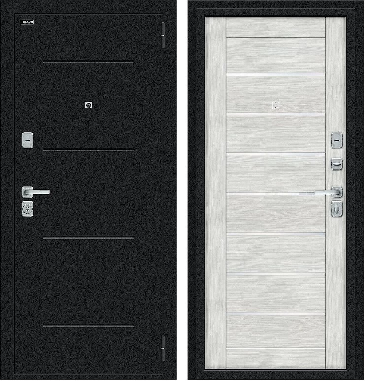 Дверь Браво Техно/BChrome Букле черное/Bianco Melinga среднего ценового диапазона. Стоит дверь 28 600 руб. и это отличное соотношение цены и качества. Модель подойдет для установки, например в новостройку. Прослужит долго и будет надежной защитой вашей квартиры или дома.